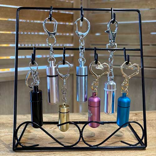 小さな遺骨を納められるキーホルダー。外出先でも身近に感じられる“つながり”があります。